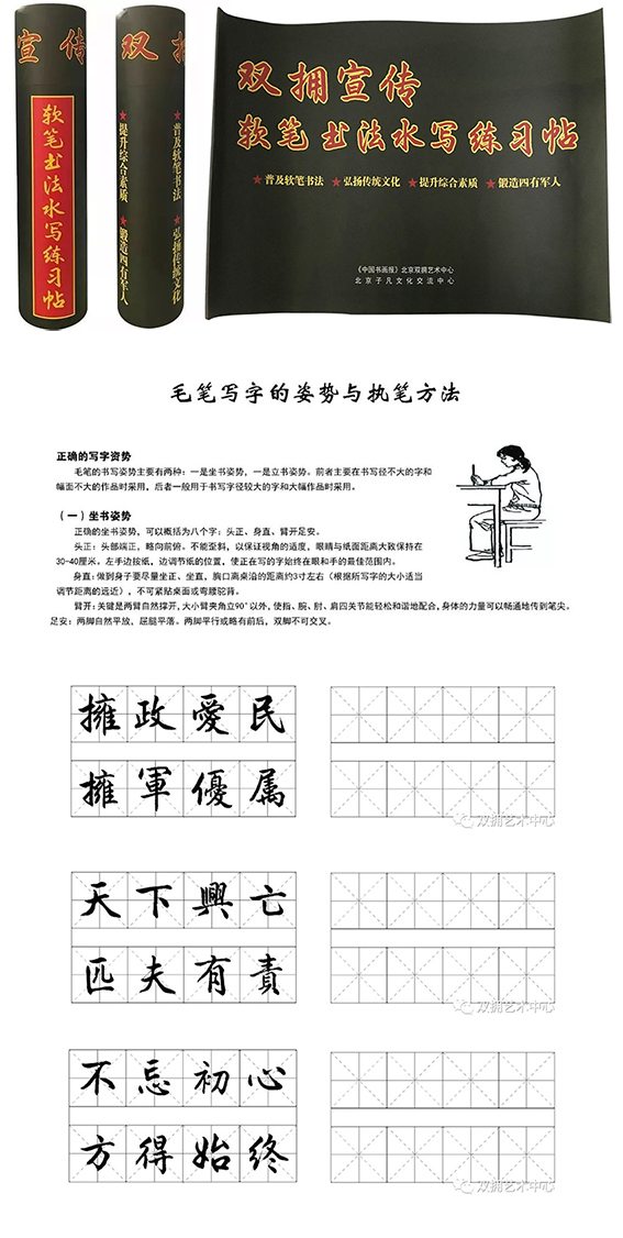 为更好的把中国优秀传统文化和双拥工作相结合,创新双拥工作宣传形式,丰富双拥活动载体。近日,获得过“首都拥军优属拥政爱民模范”称号的苗鹏主任组织书法名家,创作了双拥内容的书法作品,并精心编辑制作《双拥宣传书法水写册》,圆筒套装,便于随身携带、收纳进行书法练习。在书法例文上选择积极向上、健康励志,弘扬社会主义主旋律的内容,在书写练习中既可以保证练好字,又能陶冶情操,弘扬正气。起到吟诵经典名句,培养家国情怀,传承红色文化的辅助教育作用。